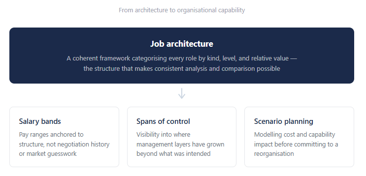 At that point, the org chart is no help at all. It shows reporting relationships. It shows nothing about how work is structured, how different roles are valued relative to one another, whether people doing comparable work are being paid consistently, or whether the shape of the organisation makes sense for the strategy it is supposed to support. It is a record of who works for whom. It is not a design.